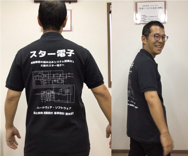 この完成したTシャツは、社長が営業に行く時や集まりに参加する時に着てます。